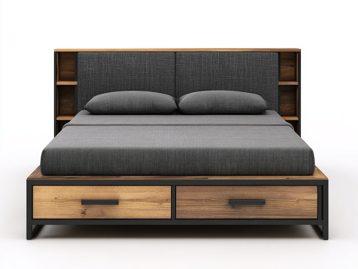 Cama doble madera y metal con almacenaje 210x160x105 cm - marrón-negro - para dormitorio - diseño industrial