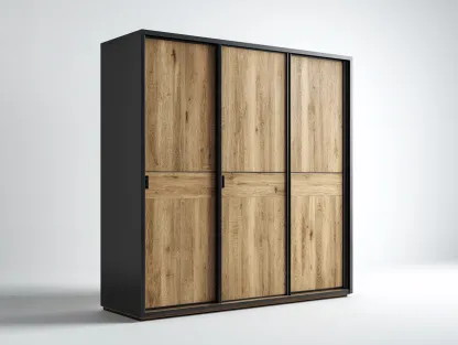 El armario está fabricado con una estructura resistente que proporciona estabilidad y durabilidad para el uso cotidiano. Los paneles frontales presentan acabado en tono madera natural que aporta calidez visual mientras que el marco exterior en color negro crea un contraste moderno y elegante. La combinación de materiales permite integrarlo fácilmente en dormitorios contemporáneos.
