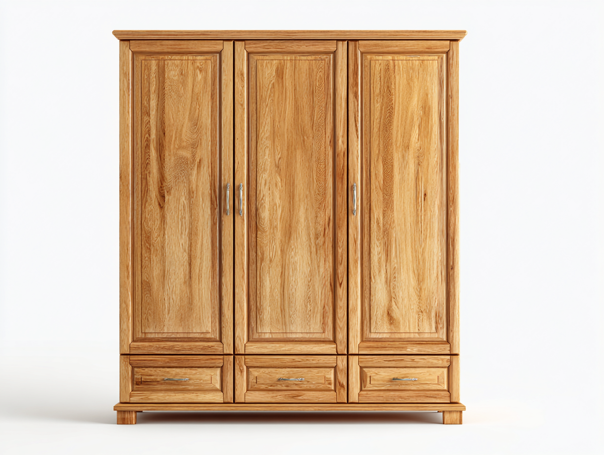 Este armario de tres puertas está diseñado para ofrecer un amplio espacio de almacenamiento en el dormitorio. Su estructura robusta y su acabado en madera natural aportan una apariencia cálida y elegante que se adapta fácilmente a diferentes estilos de interior. Gracias a su diseño vertical proporciona una solución práctica para organizar ropa accesorios y artículos personales.